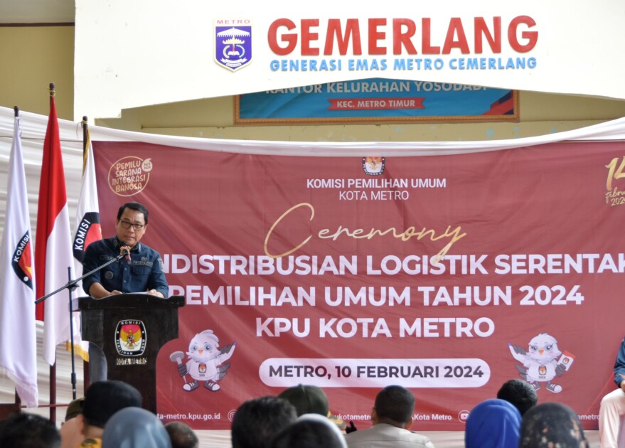 Secara simbolis pelepasan logistik Pemilu 2024 ini dilakukan oleh Wali Kota Metro, dr. Wahdi Siradjuddin, Sp.OG(k), M.H, didampingi Wakil Walikota Metro Drs. H. Qomaru Zaman, MA bersama Ketua KPU Nurris Septa Pratama di gudang logistik KPU yang ditempatkan di aula Kelurahan Yosodadi, Sabtu (10/02/2024).